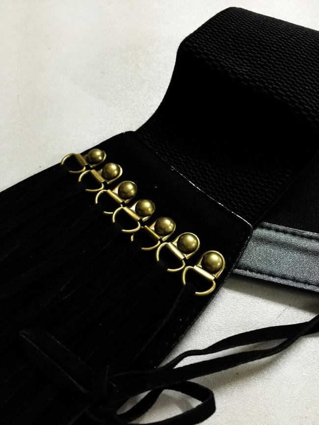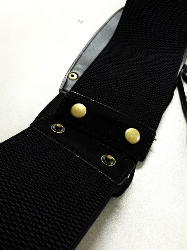 ゴールド留め編み上げ・コルセットベルト 旬なスタイルに変身!コルセットベルト ワンピやチュニックにONで痩せスタイルの出来上がり♪ ゴールドの留めに編み上げのデザインがカッコいい ■規格・容量 色:黒色 素材:人造革、弾力ゴム 裏地:なし 弾性:強い サイズ: 立て7.5cm~11cm(人造革は11cm、後ろゴムは7.5cm)、長さ70cm(弾力強い