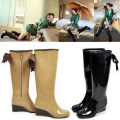 バックリボン・レインブーツ ロングのバックリボン付可愛いレインブーツ 雨の日にも可愛く足元を演出してくれるブーツ ■規格・容量 色:黒色、杏色 素材:100%PVC サイズ:22.5cm~23cm(35~36/S) 23.5cm(37/M) 24cm(38/L) 24.5cm~25cm(39~40/LL) ヒール(約)6cm、筒の高さ(約)36cm、筒周り(約)37cm